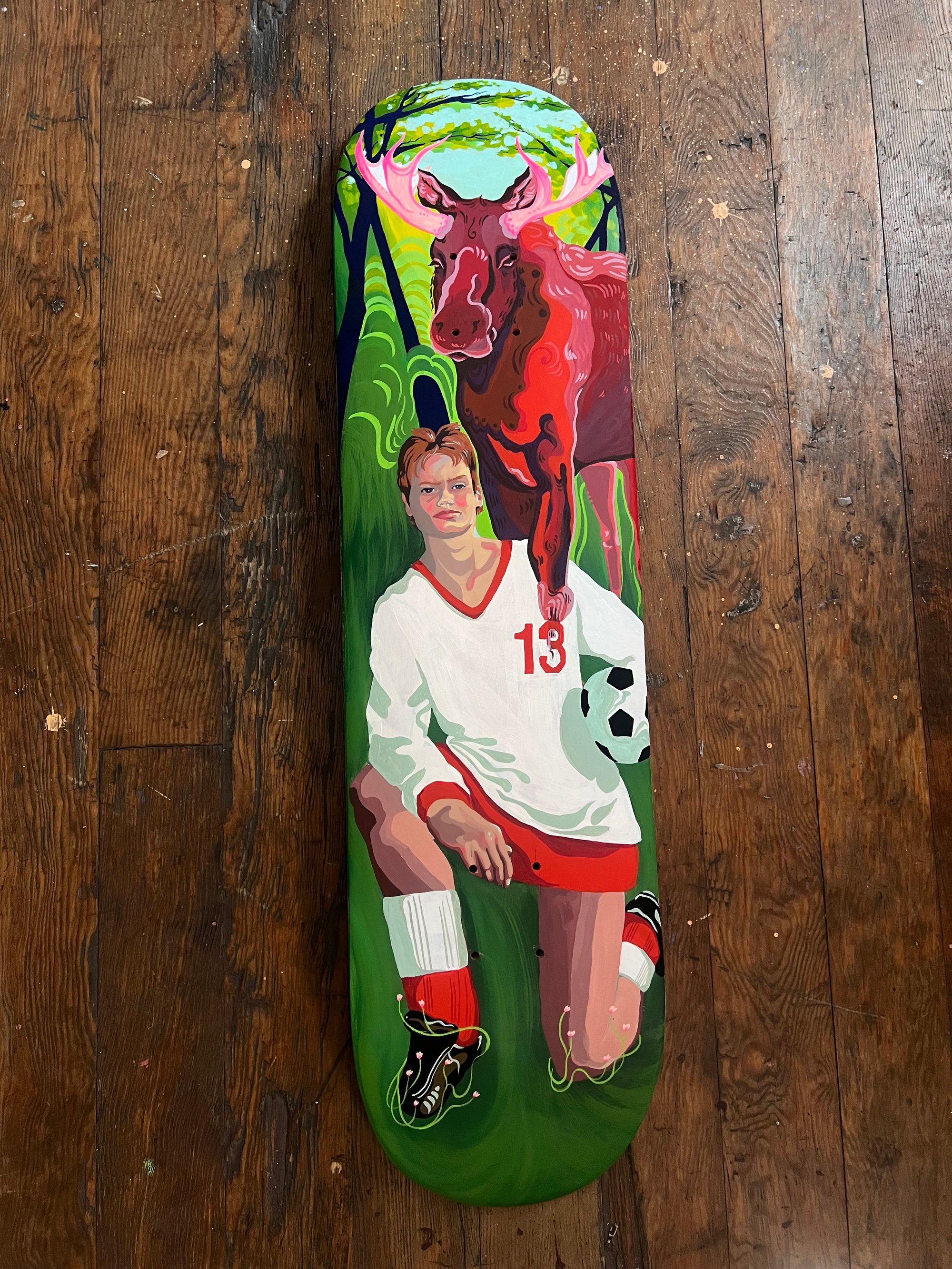 Acrylic on skateboard 2026 Conversations with you are like holding up a mirror I inherited your nose, your curl pattern, your sharp tongue Our anger and humor intertwined like a cocoon to keep us safe I love you, Dad